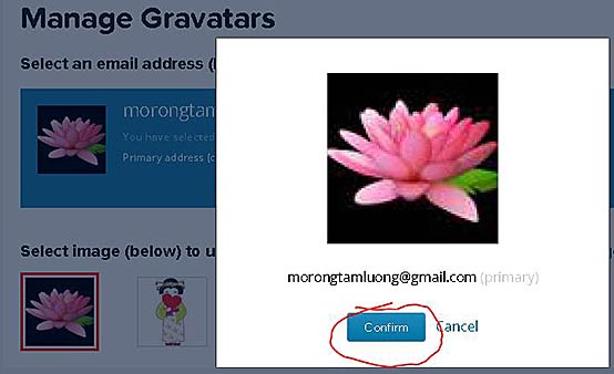 • 20- Để chọn hình mới upload dùng làm avatar, chúng ta phải bấm lên hình vừa mới upload, một khung cửa sổ nhỏ hiện ra, bấm nút Confirm. Vậy là chúng ta đã thay đổi hình avatar mới.