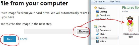 • 9- Bấm vào nút Browse để upload hình từ máy lên server (cỡ 100 x 100 hay nhỏ hơn để hình rõ nét), sau đó bấm Next. (Quý vị có thể sửa kích cỡ hình cho nhỏ lại tại địa chỉ www.resizeyourimage.com.)