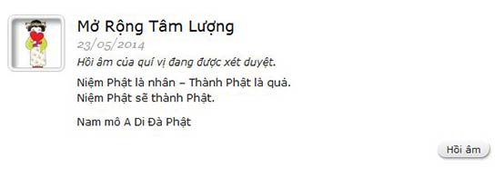 Đó là vì phúc đáp của quý vị đang trong thời gian chờ xét duyệt. Mỗi ngày chúng tôi nhận được một lượng lớn phúc đáp mang tính quảng cáo (spam) nhiều hơn các bài mang tính học hỏi về giáo lý Phật đà. Do vậy ban quản trị phải xét duyệt từng bài một và xoá bỏ hay cắt bớt những đoạn không cần thiết dễ gây hiểu lầm cho người đọc.